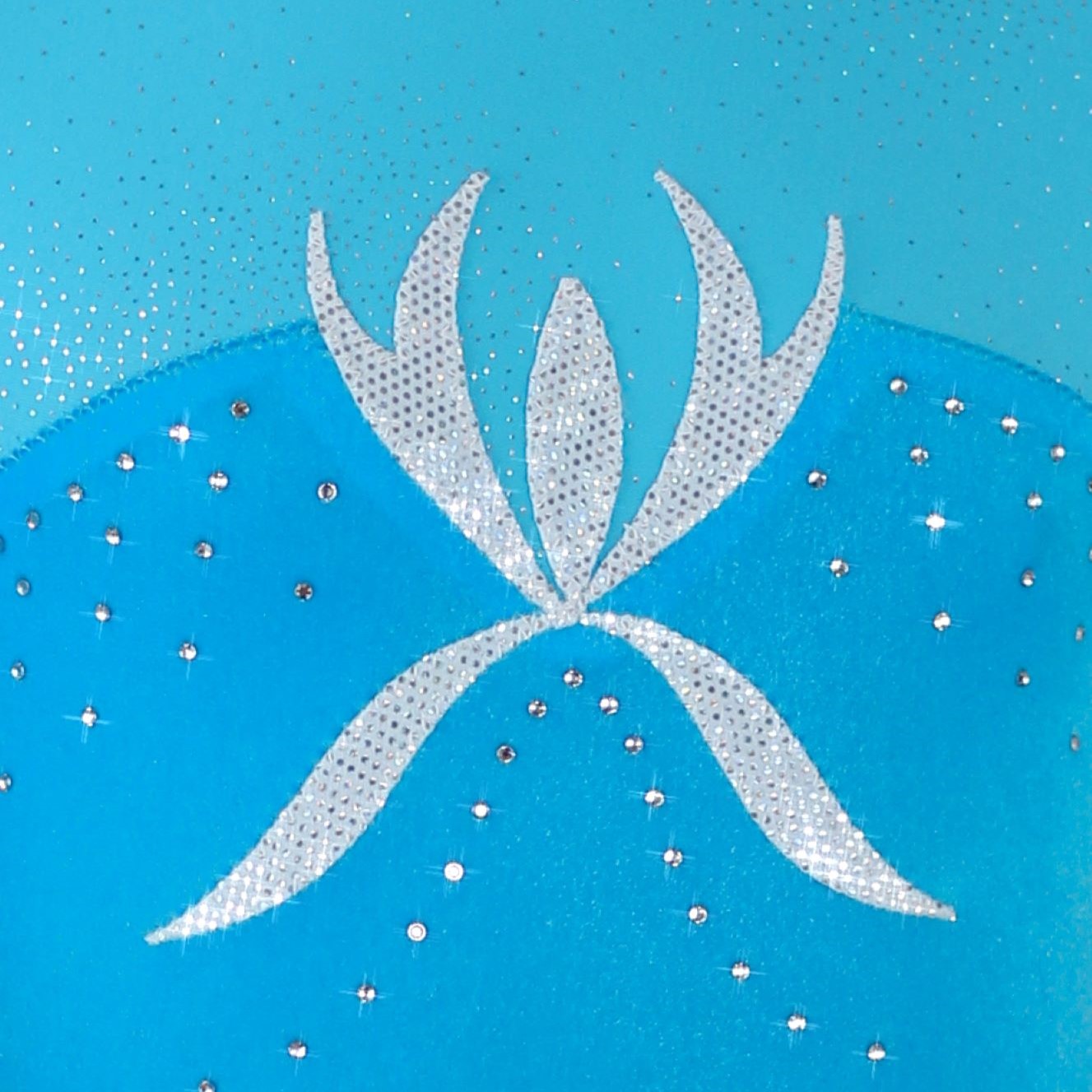 Turnanzug in samtigem Türkis-Blau mit silberner Applikation und glitzerndem Strassmuster – bequem, auffällig und ideal fürs Training.